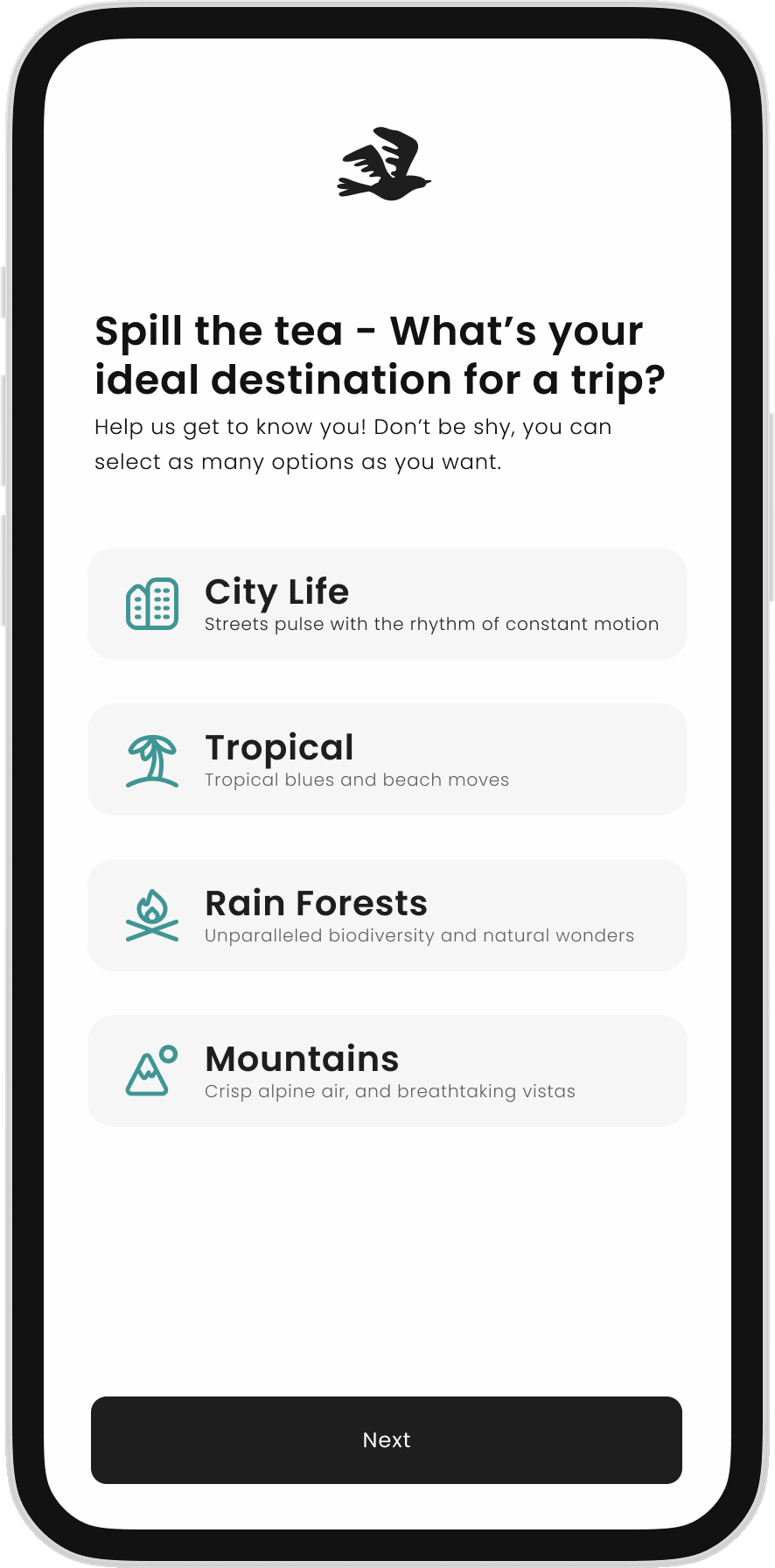 I designed this onboarding process with simplicity and user engagement in mind. The brief welcome message sets a friendly and inviting tone, making users feel comfortable. The prompts are intentionally straightforward to help in gathering essential information about a user’s preferences and travel habits, ensuring we can provide a tailored trip planning experience from the very beginning.